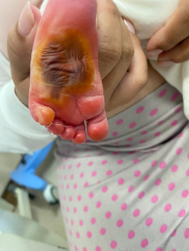 Um bebê recém-nascido sofreu queimaduras no pé poucas horas após nascer no