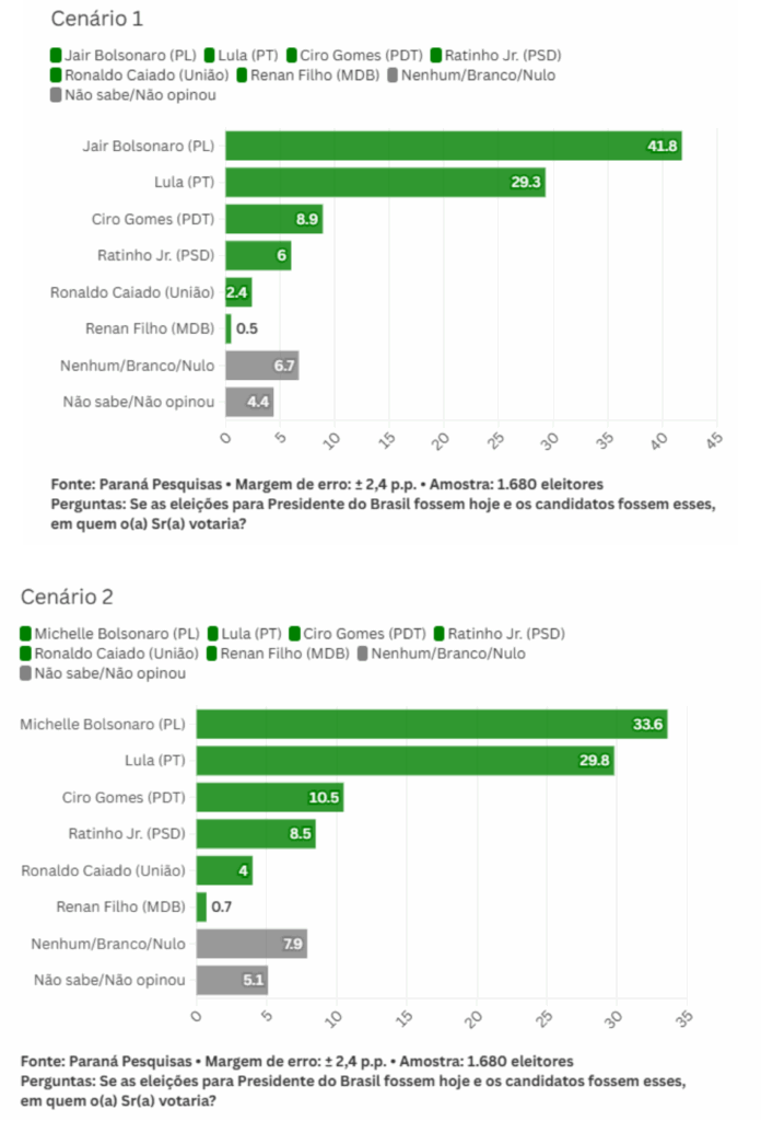 Por outro lado, Lula aparece tecnicamente empatado em simulações que envolvem Michelle Bolsonaro (PL) e Eduardo Bolsonaro (PL-SP). Enquanto Michelle leva vantagem sobre o petista, no confronto com Eduardo, Lula fica na liderança.