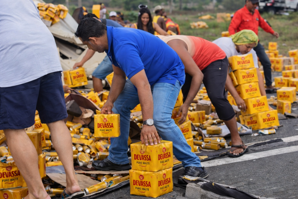 Vídeos que circularam nas redes sociais mostram dezenas de pessoas recolhendo caixas de cerveja às margens da rodovia. Imagens também registram veículos parando no acostamento para carregar parte da mercadoria.