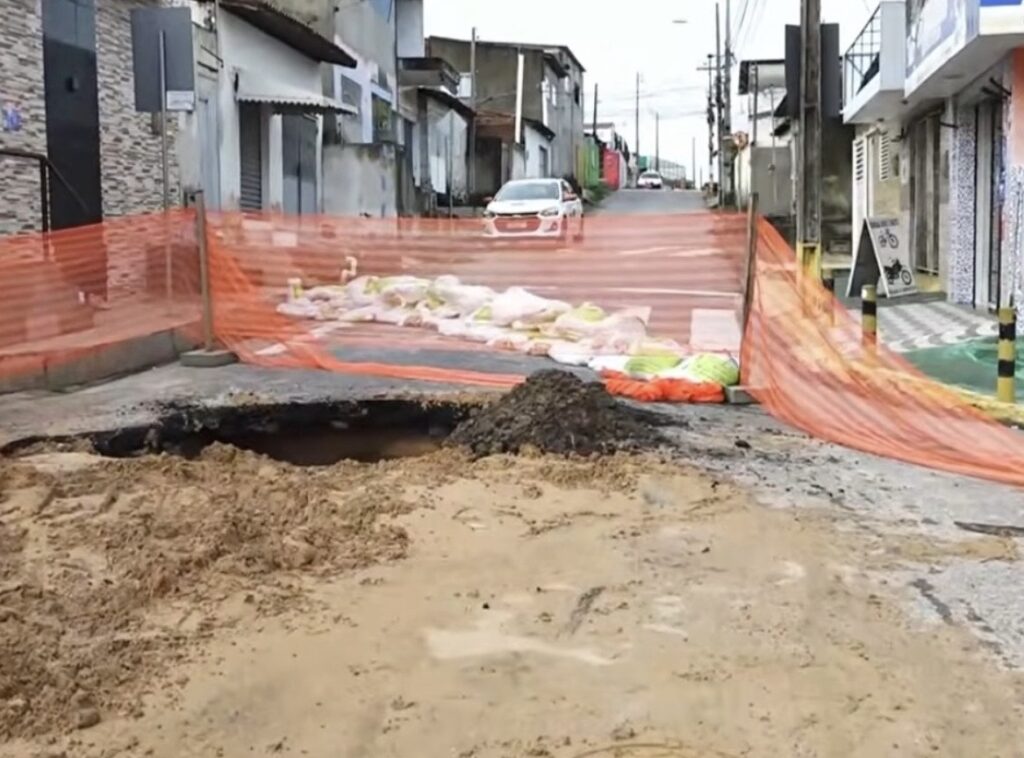 O buraco já existia, segundo moradores, mas se ampliou rapidamente com o volume de água acumulado. A cratera se formou bem no meio do cruzamento, comprometendo o tráfego e aumentando o risco para quem circula pela região.