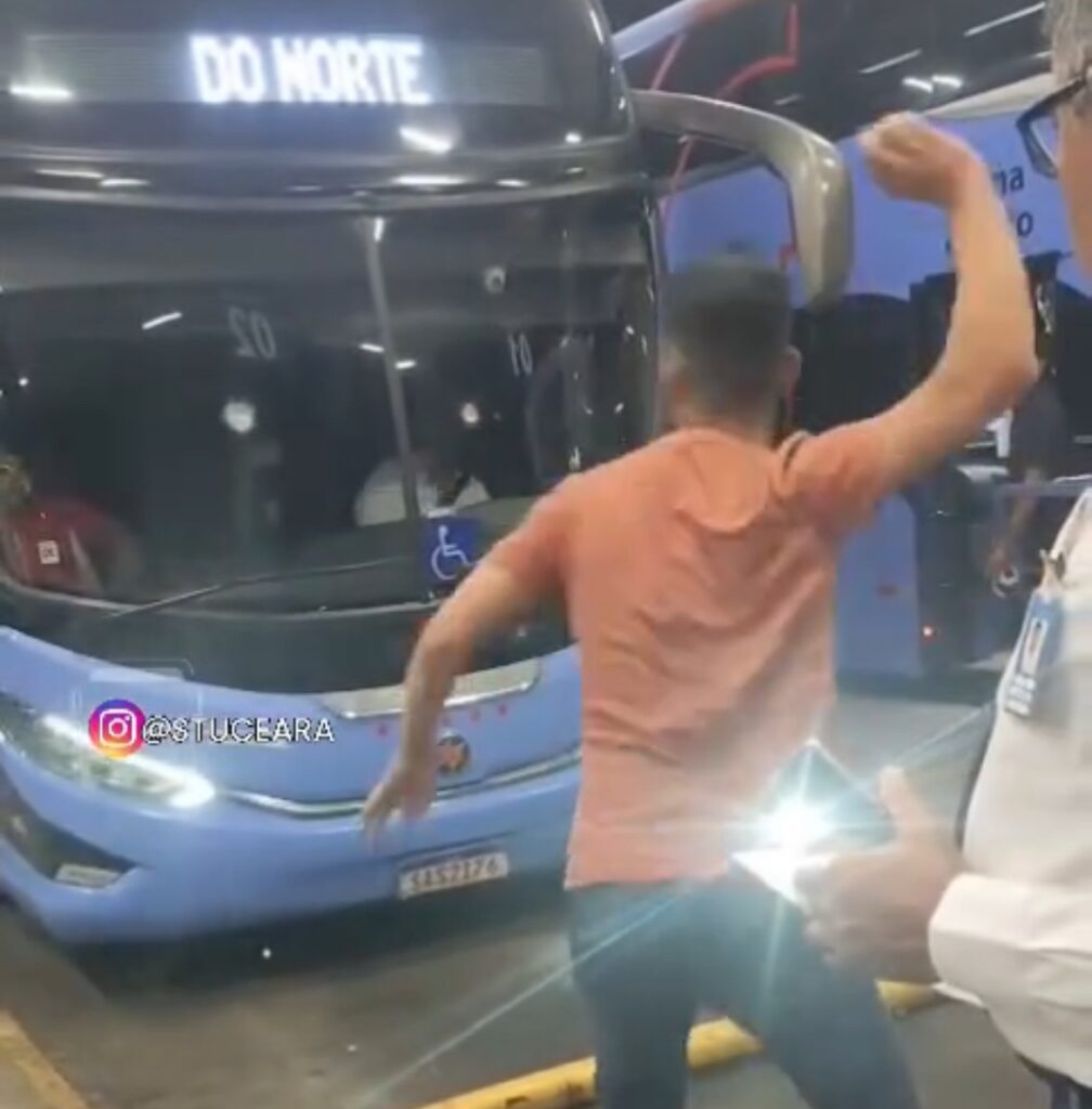Ao ser informado que não poderia seguir viagem, o homem se exaltou, recusou-se a deixar o veículo e impediu a saída do ônibus. Testemunhas relataram que, durante a confusão, ele arremessou pedras contra a parte frontal do coletivo, causando danos ao patrimônio.