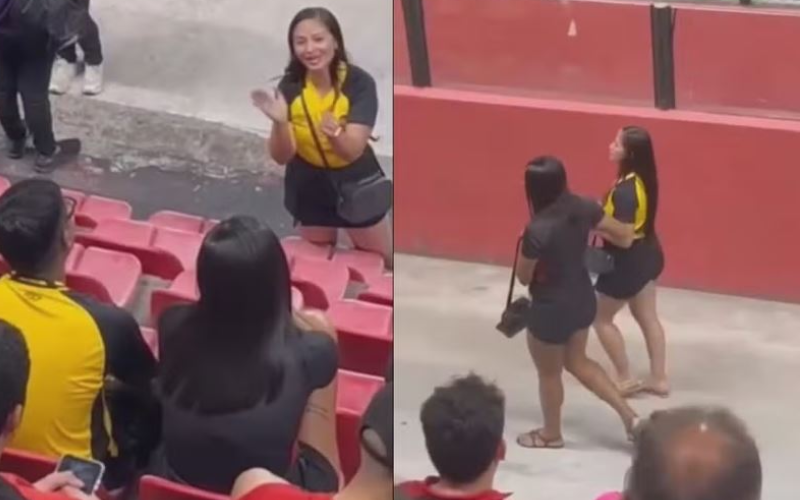 O desfecho, no entanto, surpreendeu o público: após a confusão, as duas mulheres deixaram o estádio juntas, enquanto o homem permaneceu sentado e visivelmente constrangido.