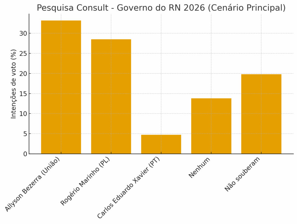 A corrida para o Governo do Rio Grande do Norte em 2026 começa a ganhar contornos de segundo turno. Segundo a pesquisa Consult, feita entre 21 e 23 de agosto, o prefeito de Mossoró, Allyson Bezerra (União), ainda lidera, mas viu sua diferença para o senador Rogério Marinho (PL) cair para apenas 4,71 pontos percentuais – praticamente empate técnico.