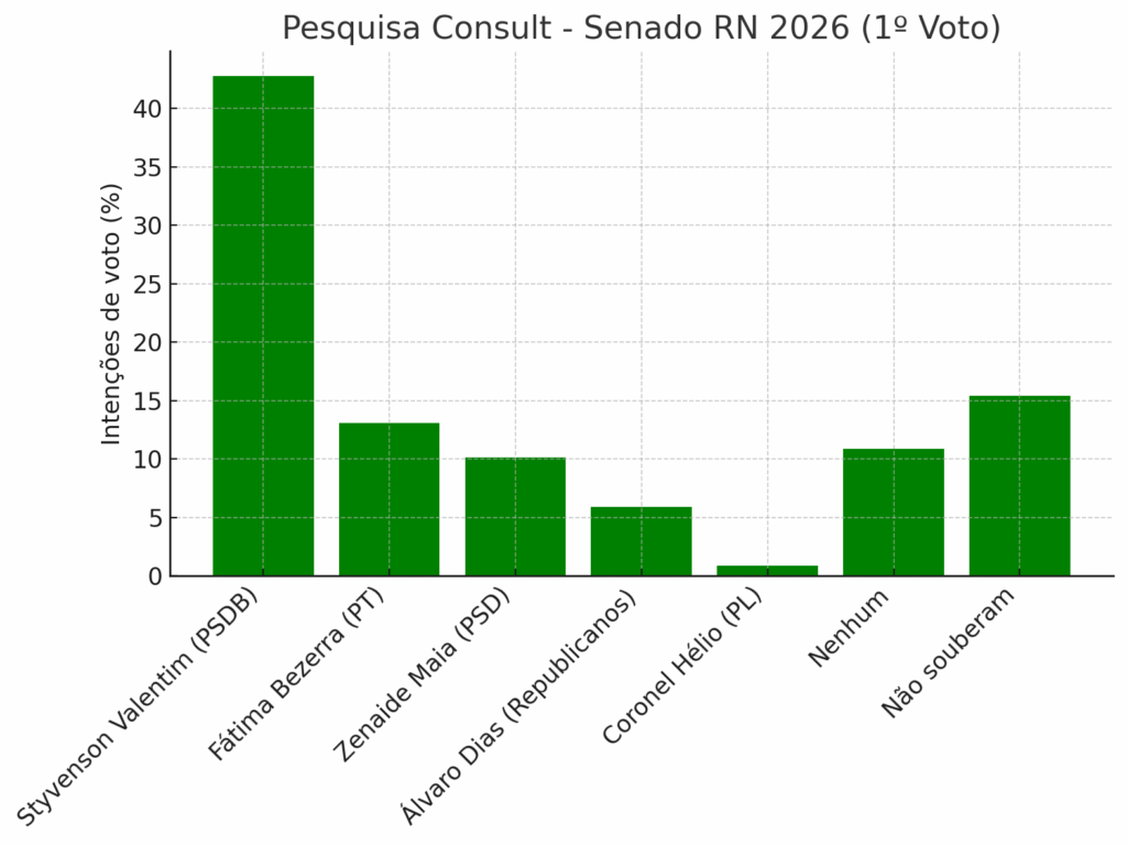 Na disputa pelo Senado, Styvenson Valentim (PSDB) aparece como favorito absoluto à reeleição, com 42,82% das intenções de voto. Em seguida vêm a governadora Fátima Bezerra (PT), com 13,06%, e a senadora Zenaide Maia (PSD), com 10,12%.