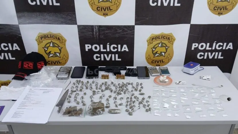 A operação foi conduzida por equipes da 2ª Delegacia de Polícia de Natal e tinha como objetivo inicial localizar um foragido da Justiça. No entanto, ao chegar ao endereço, os agentes se depararam com atividades criminosas ligadas ao tráfico de drogas, associação criminosa, porte ilegal de arma e receptação.