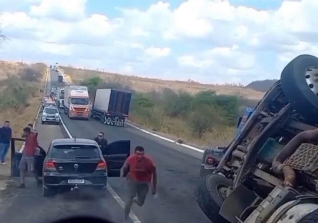 Na manhã deste sábado (22), uma carreta tombou na BR-116, entre os municípios de Ipaumirim e Icó, deixando o trânsito parcialmente bloqueado. Com a carga espalhada pela pista, moradores da região se aproveitaram da situação para recolher parte do material transportado.