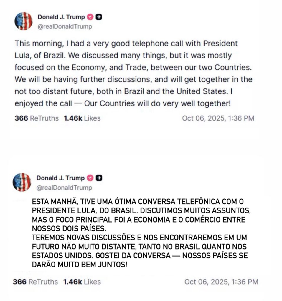 “Esta manhã, tive uma ótima conversa telefônica com o Presidente Lula, do Brasil. Discutimos muitos assuntos, mas o foco principal foi a economia e o comércio entre nossos dois países.